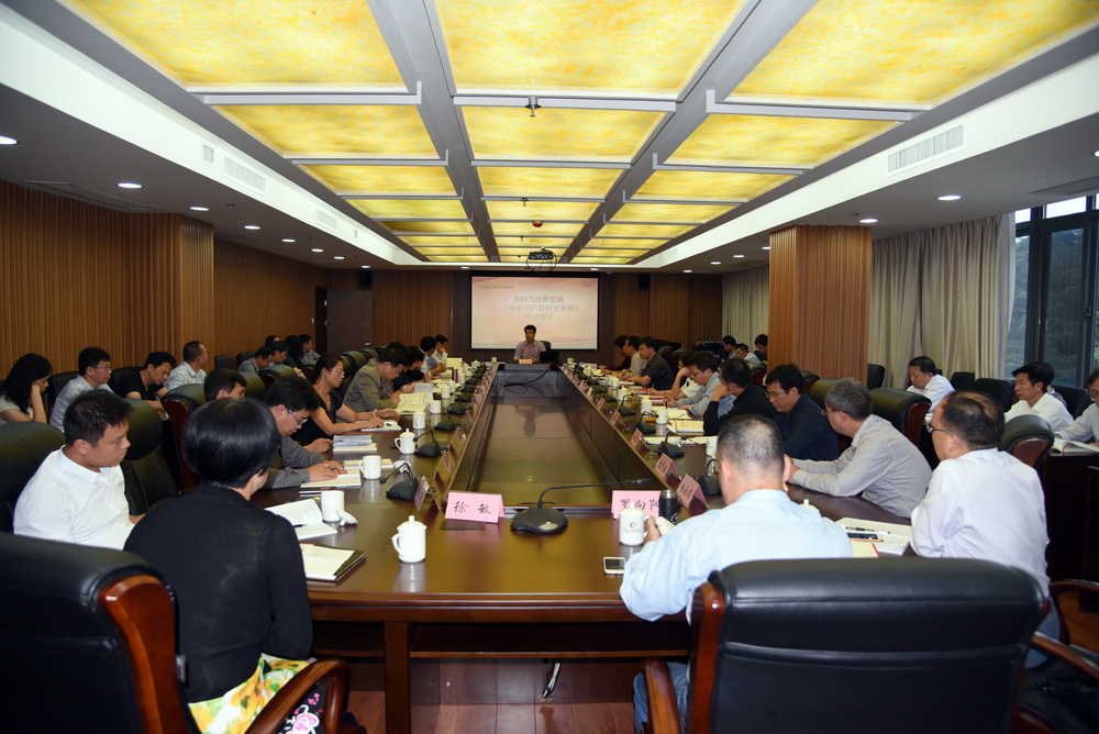 《中国共产党问责条例》(以下简称《问责条例》)是全面从严治党、依规治党、强化党的问责工作的重要制度遵循和全面从严治党的“利器”。认真学习理解和贯彻执行《问责条例》,对于唤醒责任意识、激发担当精神,推进全面从严治党向基层党组织延伸具有重要意义。结合当前开展的“两学一做”学习教育,10月11日下午,学校举行2016年党委中心组第八次(扩大)学习会,以“用担当诠释忠诚”为主题,专题学习《问责条例》。党委书记马国防主持会议,校党委委员陈兴炎、吴国荣、陈展虹、沈光辉、王幼新到会学习,学校副处级以上干部也共同参加学习会。