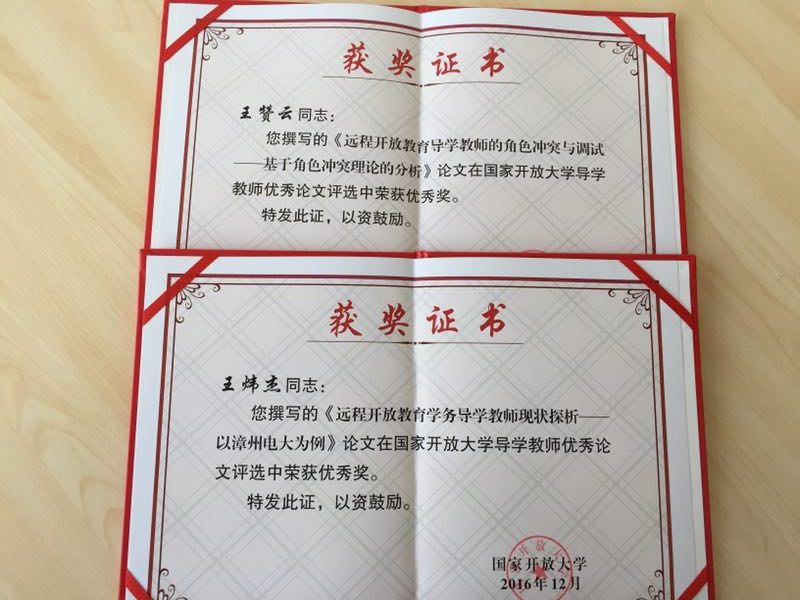 由教学管理中心评选、推荐的漳州分校王赞云老师撰写的《远程开放教育导学教师的角色冲突与调试--基于角色冲突理论的分析》与王炜杰老师撰写的《远程开放教育学务导学教师现状分析--以漳州电大为例》论文获国家开放大学导学教师优秀论文奖。