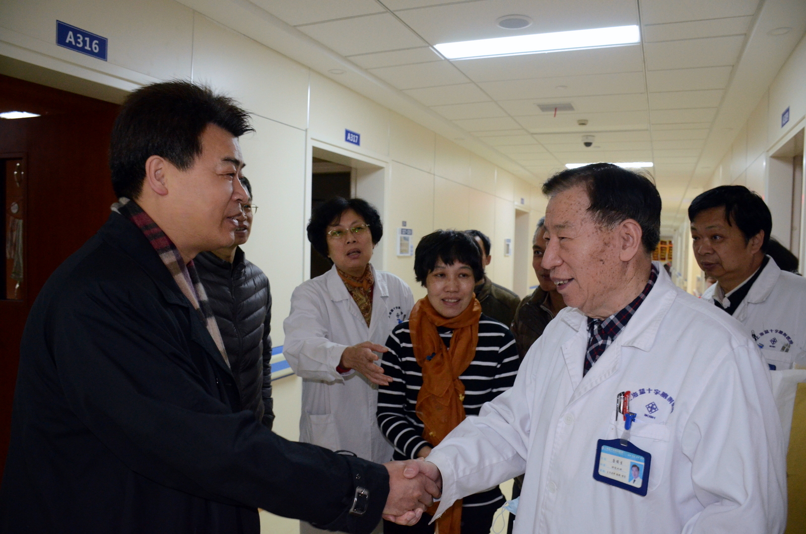 在医院病房,马国防拉着昏迷中郑元齐的手,向他表达了全体校领导、教职工的关心和祝福,希望他战胜伤病,早日康复,回到工作岗位中。