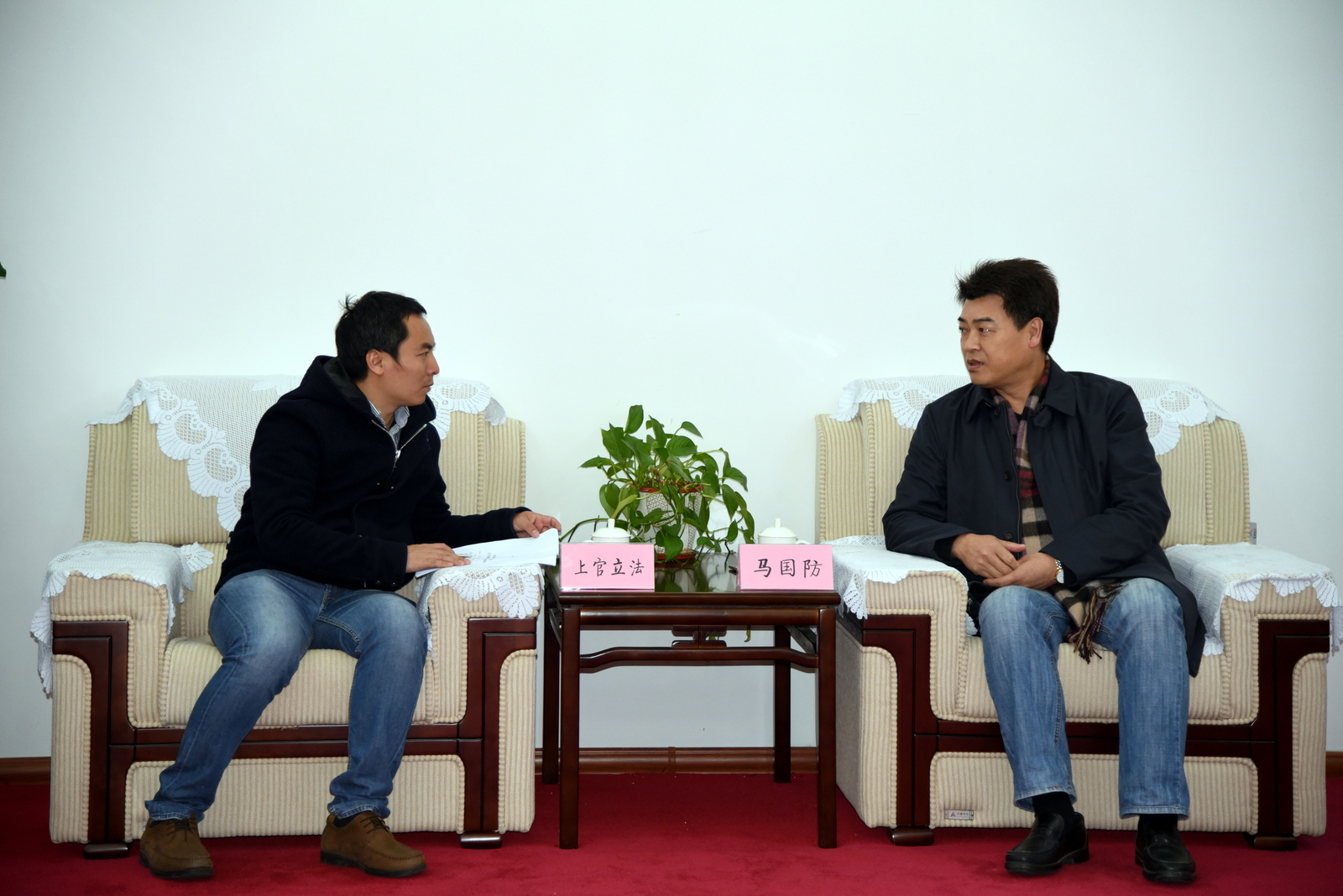 福建电大党委书记马国防(右)与省教育电视台记者上官立法(左)
