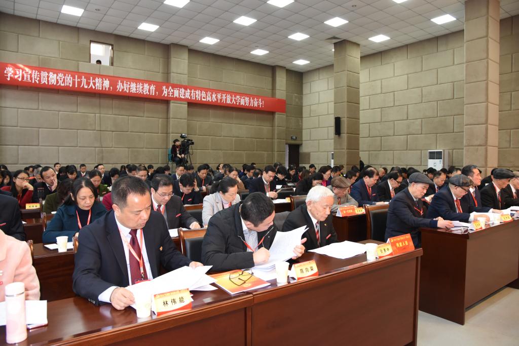校领导陈兴炎、吴国荣、马成斌、陈展虹、沈光辉、王幼新,省政协委员马国防,省委教育工委组织处调研员郭林出席大会,离退休校领导、各设区市电大分校领导应邀列席会议。