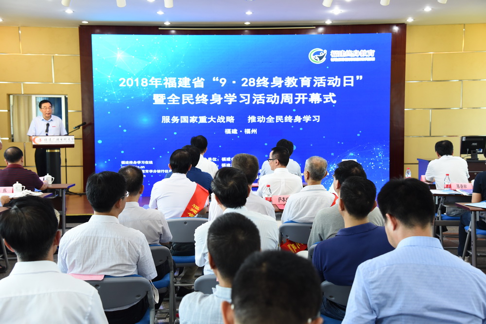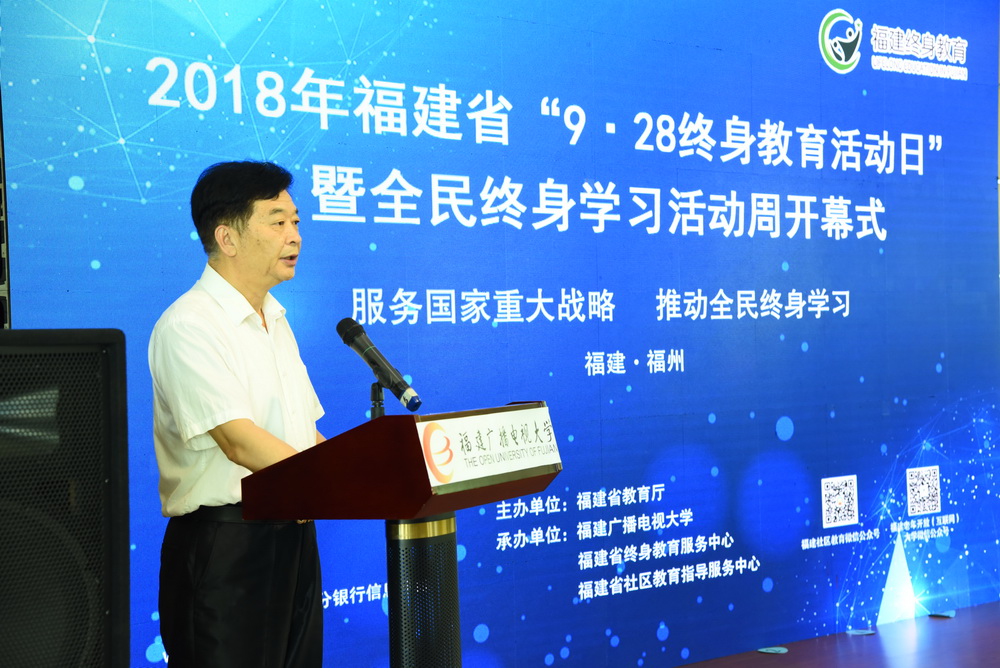 9月28日上午,2018年福建省“9.28终身教育活动日暨全民终身学习活动周”开幕式在我校举行。本次“9.28终身教育活动日”是福建省贯彻落实党的十九大报告关于“办好继续教育,加快建设学习型社会,大力提高国民素质”重要精神的具体举措。活动由省教育厅主办,我校承办。省第十一届政协副主席、省老年大学协会会长,省老年大学校长杨根生,福建广播电视大学校长吴国荣、党委副书记马成斌、副校长陈展虹、纪委书记王幼新,福建老年大学副校长马玉良,省民政厅副巡视员郑成林,省教育厅职业教育与成人教育处处长张文东、调研员刘会勇,福州职业技术学院院长李秋斌及省老龄办、福州市教育局、福州市社区大学、南平市社区大学、鼓楼社区学院、罗源社区学院等领导,福建老年开放(互联网)大学学员、福建省2018年“百姓学习之星“代表等100多人出席开幕式。仪式由副校长沈光辉主持。