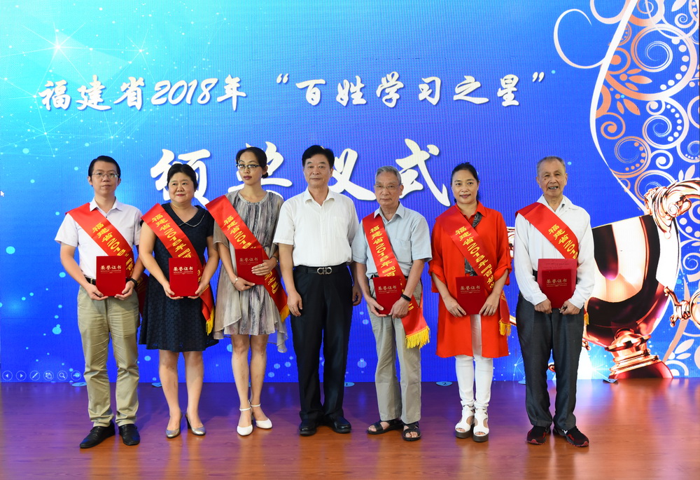 六位福建省“百姓学习之星”代表上台领奖。萨本珪、李瑜芳代表获奖学员发表了获奖感言。89岁高龄的萨本珪,退而不休,几十年如一日坚持学习不放松,身体力行“活到老,学到老”,用自身事例完美诠释了终身教育理念,他的好学精神引发了现场阵阵热烈的掌声。