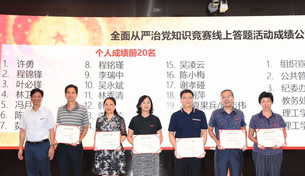 为深入学习习近平新时代中国特色社会主义思想和党的十九大精神,强化党章党规党纪教育,落实全面从严治党主体责任,9月11日下午,学校在左海校区智慧教室举办全面从严治党知识竞赛。省纪委教育工委书记、省纪委派驻省教育厅纪检组组长巫文通应邀出席活动,校党委书记陈兴炎、副书记马成斌、纪委书记王幼新参加活动。