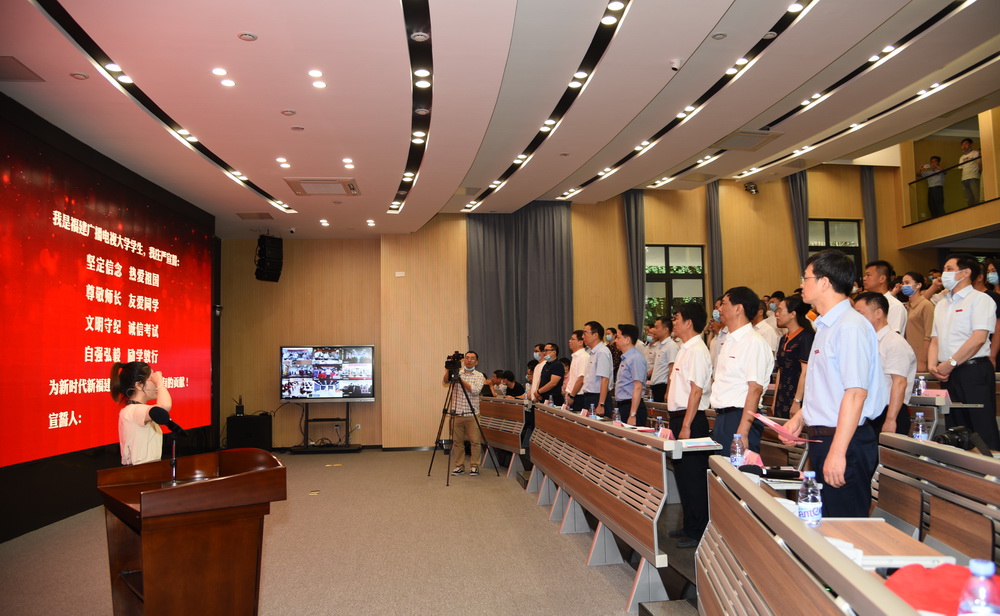 马成斌主持开学典礼。在嘹亮雄壮的国歌声中,福建广播电视大学2020年春季开放教育新生开学典礼暨同上开学第一课正式启幕。各地电大领导分别在当地为国家开放大学2019年度优秀毕业生颁发了获奖证书。本科新生代表、专科新生代表、在校生代表和教师代表在当地电大发言。各地电大校领导为新生代表佩带校徽、颁发学生证,新生同步进行了入学宣誓。