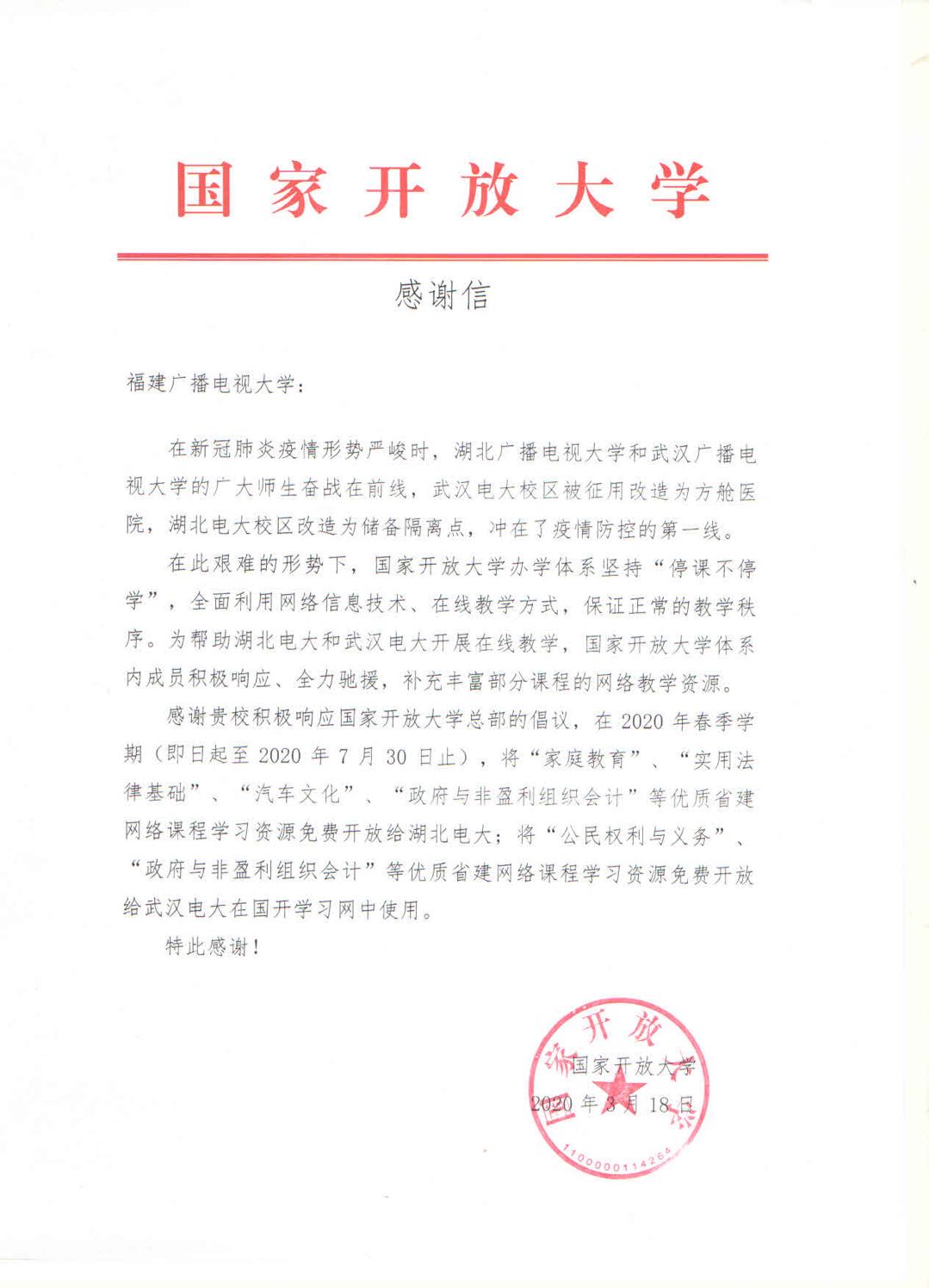 学校紧贴经济社会发展需要,提升办学质量进入新篇章。2020年全省开放教育招生31850人,其中直属专业学院招生1369人。为企业量身定制专业培养方案,服务各行业企业人才培养,为抗疫一线的公安警务辅助人员和环卫行业职工设立学历与技能专班;设立“职工课堂”送教入企;成立福建广播电视大学百胜学院(国家开放大学福建分部百胜学院);“求学圆梦行动”迎来了首批毕业生,项目实施成果丰硕,今年共为15864名开大农民工学员申请学费补助达1586.4万元,大大减轻了农民工学习负担。