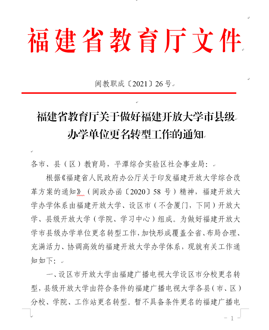 近日,福建省教育厅印发《关于做好福建开放大学市县级办学单位更名转型工作的通知》(闽教职成〔2021〕26号,以下简称“《通知》”),推动我省市县电大更名转型。