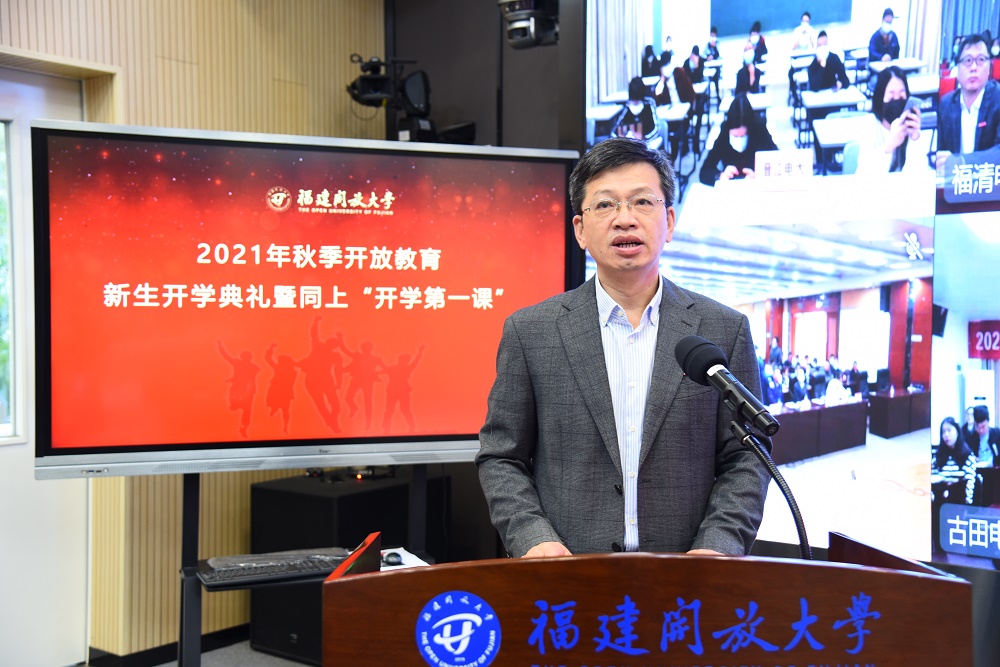校党委书记陈兴炎在致辞中向新同学表示欢迎。他介绍了福建开放大学的历史,以“自强弘毅、励学敦行”校训精神与大家共勉,希望同学们珍惜韶华、奋发有为,努力成为德才兼备的有用之才、栋梁之才。一要“立大志”,以“自强”的精神信念铸就梦想之魂。二要“明大德”,以“弘毅”的坚韧品格丰足梦想之翼。三要“成大才”,以“励学”的刻苦努力筑牢梦想之基。四要“担大任”,以“敦行”的前进步伐成就梦想之实。