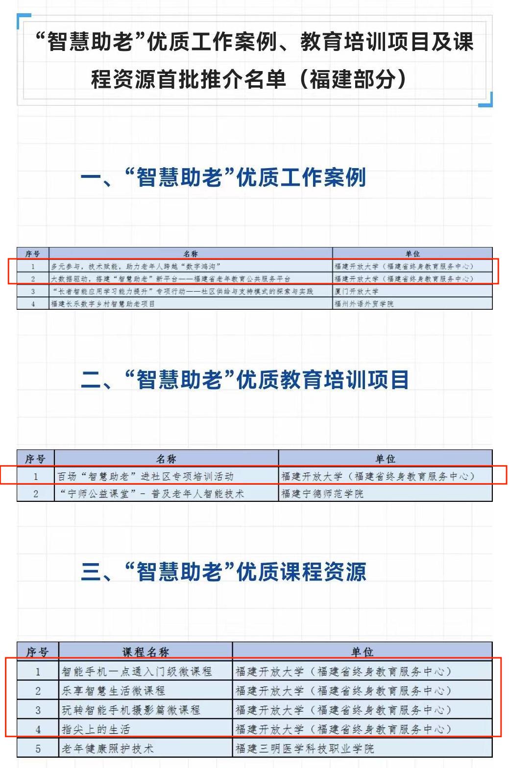 4月13日,教育部公布了首批国家级“智慧助老”优质工作案例(38个)、优质教育培训项目(65个)和优质课程资源(64门)推介名单,福建省共有11个项目入选,其中我校7个项目(2个工作案例,1个培训项目和4门课程资源)入选。