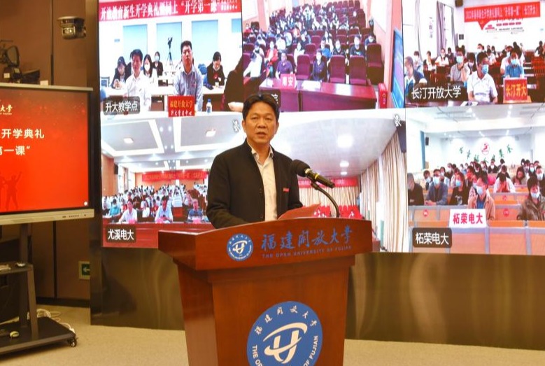 校长吴国荣在致辞中向新同学表示欢迎。他介绍了福建开放大学的历史,以“自强弘毅 励学敦行”校训精神与大家共勉,希望同学们坚持党的领导、坚持胸怀天下、坚持开拓创新、坚持敢于斗争、坚持自我革命,努力学习,以知识改变命运,用奋斗创造精彩,在新时代新征程上争取更大荣光。