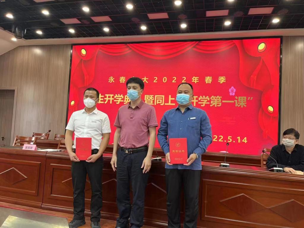 永春县教育局局长陈志宏在永春电大为2021年度优秀毕业生颁发荣誉证书
