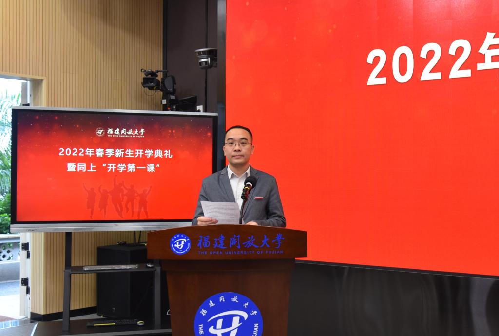 5月14日上午,福建开放大学举办2022年春季新生开学典礼,并同上“开学第一课”。校领导陈兴炎、吴国荣、马成斌、沈光辉、李正光与学校相关部门负责人和教师代表、直属学院新生代表在桂山校区主会场参加,全省各市县电(开)大、教学点的教师和2022年春季入学的新生通过分会场和收看线上直播方式参加活动。典礼由校党委副书记马成斌主持。