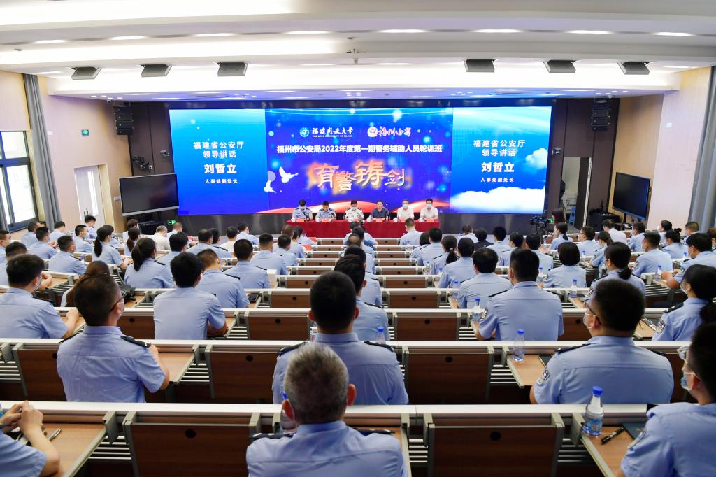 7月12日上午,在全省上下深入学习贯彻党的十九届六中全会精神、聚力“提高效率、提升效益、提增效能”行动之际,福建开放大学、福州市公安局辅警学院2022年度第一期“育警铸剑”主题警务辅助人员教育培训班在福建开放大学桂山校区智慧教室正式开班。福建开放大学党委委员、副校长李正光,福州市公安局党委委员、政治部主任郑南,福建省公安厅人事处副处长刘哲立等领导出席开班仪式。首期培训共有100名辅警学员代表参加。