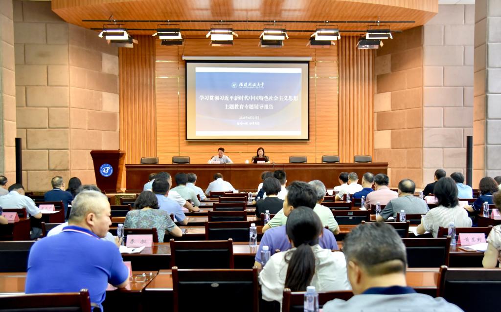 6月27日上午,学校举办学习贯彻习近平新时代中国特色社会主义思想主题教育读书班第六场专题辅导报告会。中共福建省委党校哲学教研部副教授、厦门大学哲学系博士姜家君作题为《跟习近平总书记学人民情怀》的专题辅导报告。报告会由校党委书记、主题教育领导小组组长陈兴炎主持。校领导沈光辉、王幼新、吴建铭及处级干部、各基层党组织书记、主题教育领导小组办公室全体成员参加报告会。
