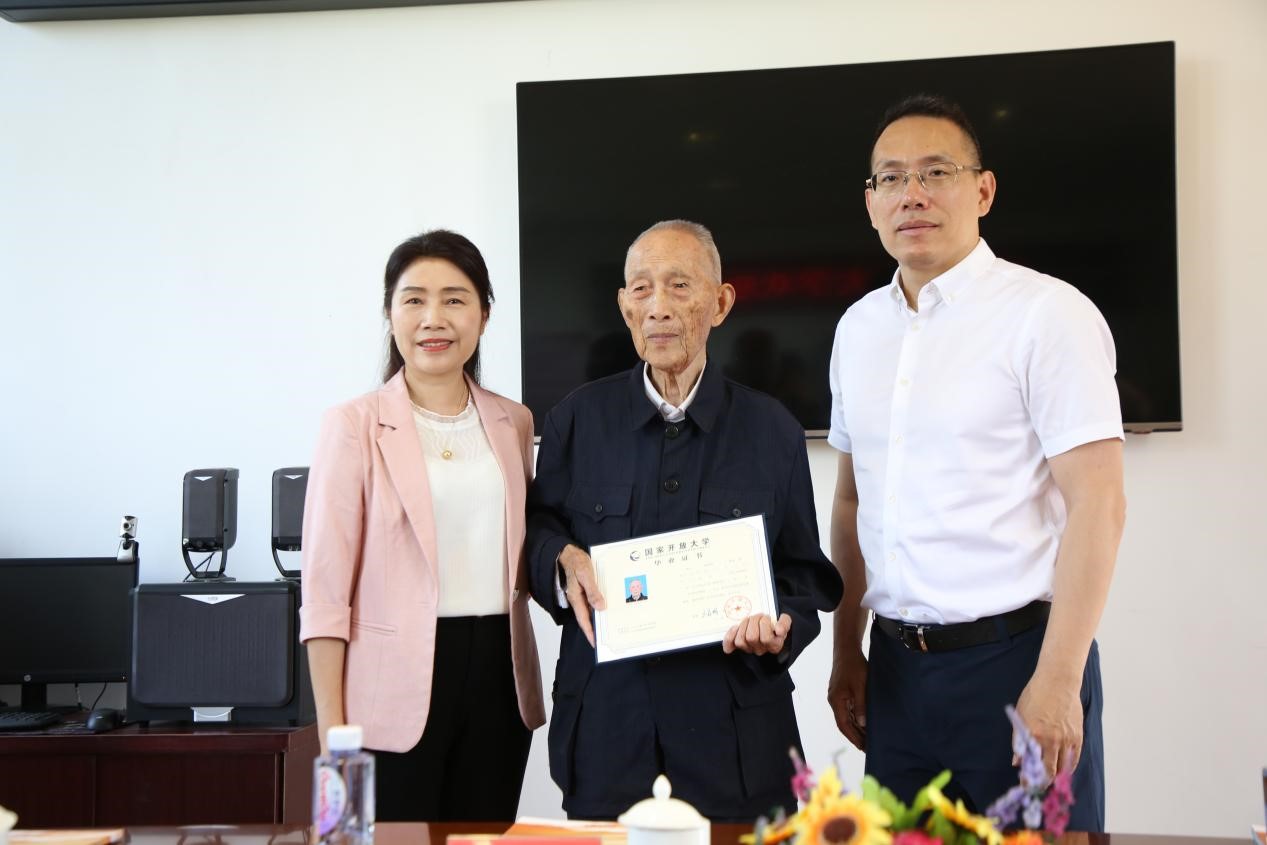 调研期间,李松一行看望并慰问终身学习楷模、国家开放大学农业经济管理专科毕业生邓仰清同学。邓仰清同学今年96周岁,2021春在沙县开放大学报名入学,2024年春季顺利毕业,成为全国最年长的开放教育在籍高校毕业生。其个人于2023年10月被评为全国 “事迹特别感人的百姓学习之星”。李松为邓仰清同学赠送了带有“福禄寿喜”寓意的国家老年大学文创礼物。