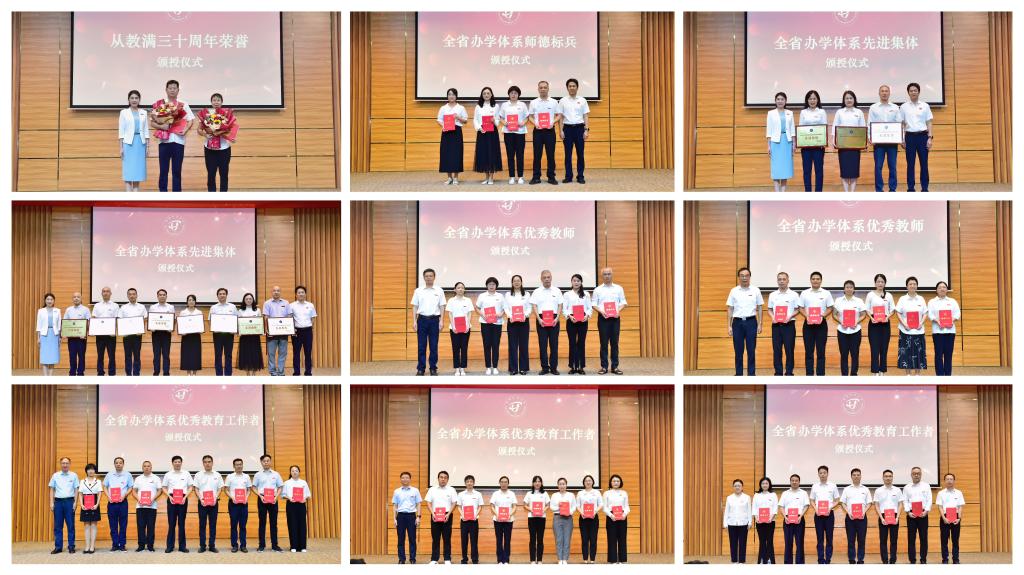校长吴国荣宣读表彰决定,授予福建开放大学3个部门、学院和15所市县开放大学2022-2024年度全省办学体系“先进集体”荣誉称号,分别授予省市县三级开放大学的128位同志2022-2024年度全省办学体系“师德标兵”、“优秀教师”、“优秀教育工作者”荣誉称号。校领导向获得“从教满30年”荣誉的教师、2022-2024年度全省办学体系先进集体和优秀个人颁发荣誉证书、奖牌。