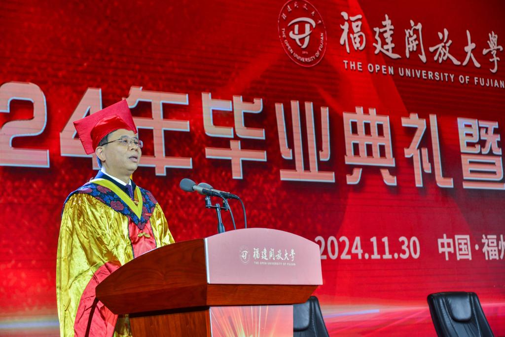 11月30日下午,福建开放大学2024年毕业典礼暨学位授予仪式在桂山校区体育馆举行。校党委书记庄莉、校党委副书记马成斌、副校长吴建铭、副校长李正光、纪委书记李琳出席典礼,国家开放大学学位评定委员会委员,全省办学体系导师代表,相关部门、学院负责人,获得学位的毕业生及其他毕业生代表300多人参加了主会场活动。毕业典礼以主分会场、线上线下互联互通的方式举行。全省万名师生通过观看直播,共同见证这一重要时刻。典礼由李正光教授主持。
