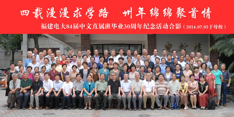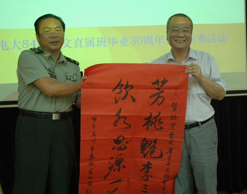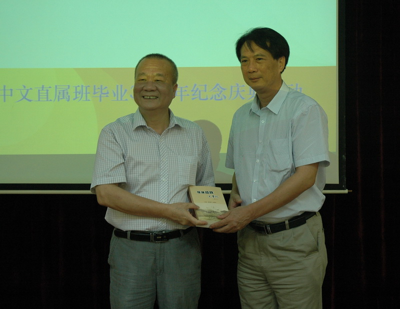 朱向前教授此次是回母校参加84届中文直属班毕业30周年纪念活动,来自四面八方的百余位校友围绕“感恩电大、回报社会、享受生活、珍惜友谊”的主题,同忆电大求学的艰苦岁月,共话千回百转的人生历程。联欢会上,李联明、孙绍振、王汾树、曾裕民老师和这些校友们回首了四年电大授课与学习的快乐时光,同叙师生情谊,共话幸福生活。校友们热情抒发了对母校培养之恩的感激,表达了对郝鸣、林华两位老师深切的缅怀之情。朱向前、孙永明、何英、萧振华、林樱尧等校友向母校赠送了自己的著作,朱向前还向母校赠送了自己的提字“芳桃艳李三十载,饮水思源一芽丁”。