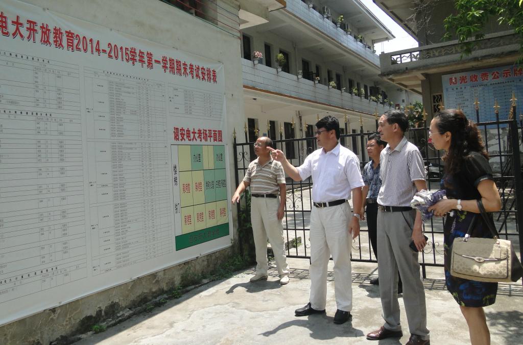 陈展虹(左二)察看诏安电大期末考试安排情况