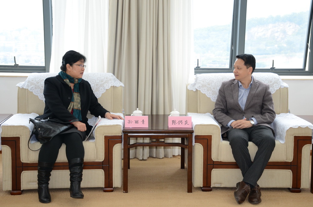 福建电大校长陈兴炎(右)与国家开放大学教学检查组组长孙丽青(左)