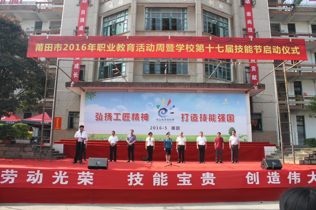 我校校长陈仁川首先致辞,他对莅临参加仪式和指导工作的领导们表示热烈的欢迎和衷心的感谢。他指出本次活动周的主题和意义,并提出我们学校要积极主动对接我市经济产业转型升级和莆田“336”工程,深化校企合作和教育教学改革,努力培养具有工匠精神、掌握一技之长的学生。莆田市教育局局长卓金贤发表讲话,他强调今年我市的职业教育活动周的主题是“弘扬工匠精神 打造技能强国”,是我市弘扬“劳动光荣,技能宝贵,创造伟大”的时代风尚。加快发展现代职业教育,是我市发挥人力资源优势,促进就业、创业,改善民生的战略举措,是为区域经济发展和产业转型升级服务。最后,张丽冰副市长宣布2016年莆田市职业教育活动周正式启动。