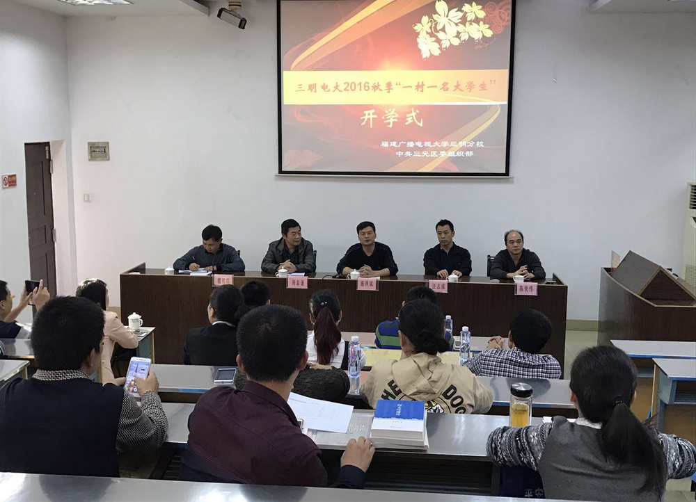 11月14日下午,三明电大举行2016年秋季“一村一名大学生”新生开学式,校领导,三元区委组织部副部长施泽斌出席了开学式。有关处室负责人、“一村一名大学生”(含社区工作者)共33名本、专科新生参加了开学式。