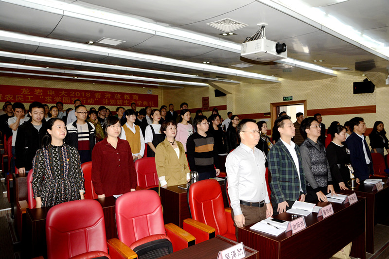 3月31日上午,龙岩电大举行2018年春季开放教育暨“农民工求学圆梦行动”计划新生开学典礼。龙岩市总工会副主席罗振基、市总工会宣教部长黄秀珍,学校党支部书记林伟能出席了典礼。全体教职工和2018年春季全体新生参加了典礼。党政联席会成员、教务处主任邱友祥主持典礼。