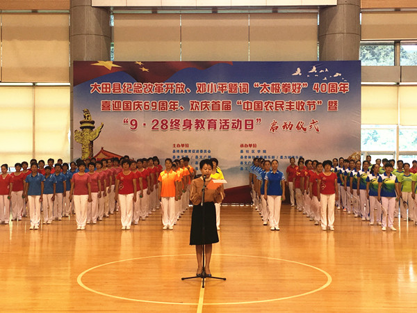 9月28日,大田县庆祝改革开放、邓小平题词“太极拳好”40周年暨2018年“9·28终身教育活动日”、全民终身学习活动周启动仪式在县体育中心篮球馆举行。县政府副县长涂林瑢出席仪式并作讲话。来自12个乡镇和城区的16支代表队、老年大学学员及社会群众共400多人参加。
