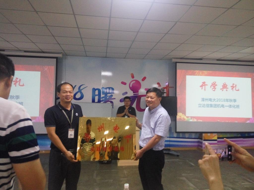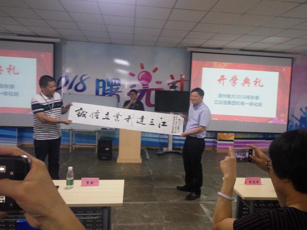 开班式上,李然代表学校向立达信集团长泰基地赠送了一幅书法家林兴斌的作品“诚信立业,利达三江”,表达了全体师生对立达信集团的敬意和美好祝愿。