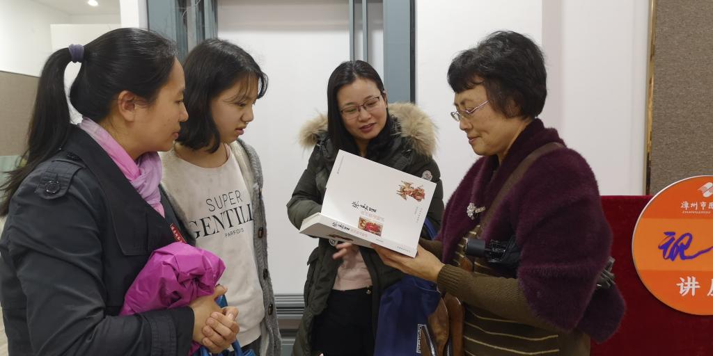 讲座以演讲、互动方式交替进行,听众热情高涨,现场气氛活跃。张老师现场选了几首朗朗上口并且有积极意义的传统童谣,与现场居民一起深情诵读。“讲咱厝的话,便是咱的人”,“月是故乡圆,水是故乡甜”等一度被遗忘在岁月角落的童谣,在耳边重新唱响。最后,张老师深入浅出地向大家解读了传诵甚广的《排甲子》,让大家共同感受这首反映陈政、陈元光平定“獠乱”的战事歌谣,带领现场听众穿越时空,重温历史。张老师告诉大家,方言和普通话不是“有你无他”的对立关系,而是应该两存互补,和谐相处,共同发展的。她号召大家要保护自己的方言,学习闽台文化,为增进两岸和谐关系贡献自己的一份力量。
