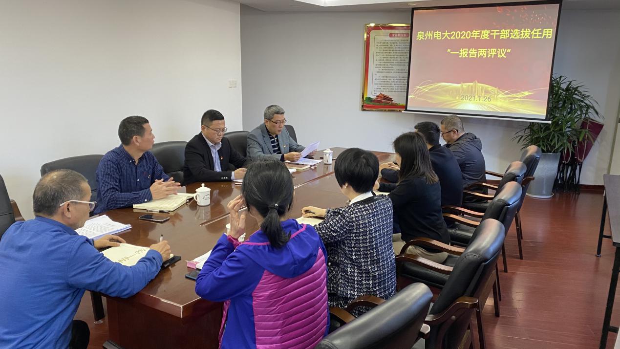 根据市委组织部工作安排,1月26日下午,泉州电大召开2020年度“一报告两评议”会议,听取2020年选人用人工作情况报告,评议提拔任用副科以上领导干部。会议由副书记郑少俊主持,学校党总支委员、各支部书记、各处室负责人以及部分基层党员干部群众代表参加会议。