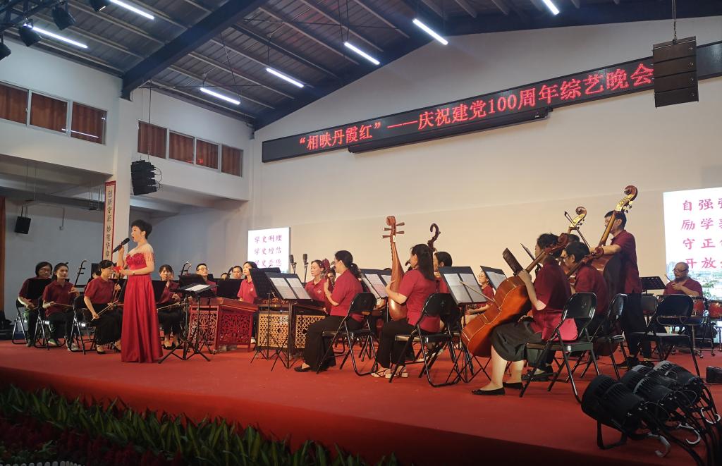 晚会现场掌声不断,气氛热烈。漳州百花合唱团、漳州电大百花民乐团的演唱荡气回肠,演奏曲调优美。漳州锦歌国家级传承人王素华弹唱《漳州小吃真正港》,以欢快活泼的节奏、通俗易懂的唱词,将漳州的民俗风情、饮食文化、人文地理娓娓道来。国家一级演员蓝海滨深情演出芗剧现代戏《谷文昌》片段,令人动容,该剧曾获得文化部文华奖和中宣部“五个一”工程奖。另外还有漳州市木偶剧团带来的人偶同台表演《欢庆》,中国大众音乐协会口琴专业委员会理事、福建开放大学吴永斌老师带来的口琴独奏《我爱你中国》,漳州电大李丹丹等歌手的演唱。最后全场同唱《没有共产党就没有新中国》,把晚会气氛推向高潮。整场演出主题鲜明、绚丽多彩、气势恢宏,热情讴歌了中国共产党100年来的光辉历程和伟大成就,从不同角度展示了开放教育师生们在新时代里坚守初心、勇担使命的风采,抒发了对党和国家,对家乡的无限深情。