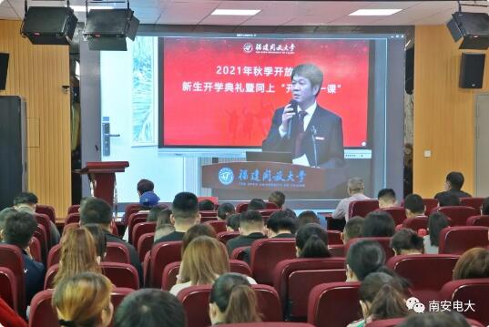 金秋送爽,硕果飘香,又是一年开学时。10月23日上午,福建开放大学、各市县电大新生和老师们共聚“云端”,通过线上线下双向视频,互联互通的方式举行了一场别开生面的开学典礼。福建开放大学“2021年秋季开放教育新生开学典礼暨同上开学第一课”主会场设在省开大桂山校区智慧教室,各市县电大、教学点设立分会场。电大南安学院陈宗辉院长带领全院教职员工及2021年秋季110多名新生代表在南安学院智慧教室同步参加,其余近千名新生也通过扫二维码全程参与了活动。电大南安学院分会场由尤春生书记主持。