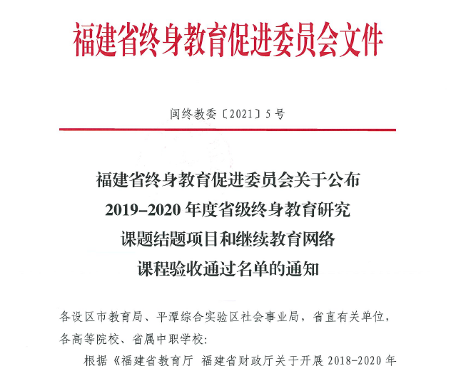 日前,福建省终身教育促进委员会公布2019-2020年度省级终身教育研究课题结题项目和继续教育网络课程验收通过名单,大田县社区学院(电大)、县文化馆联合拍摄制作的继续教育网络课程《大田板灯龙》、《杂剧作场戏》两门课程上榜。