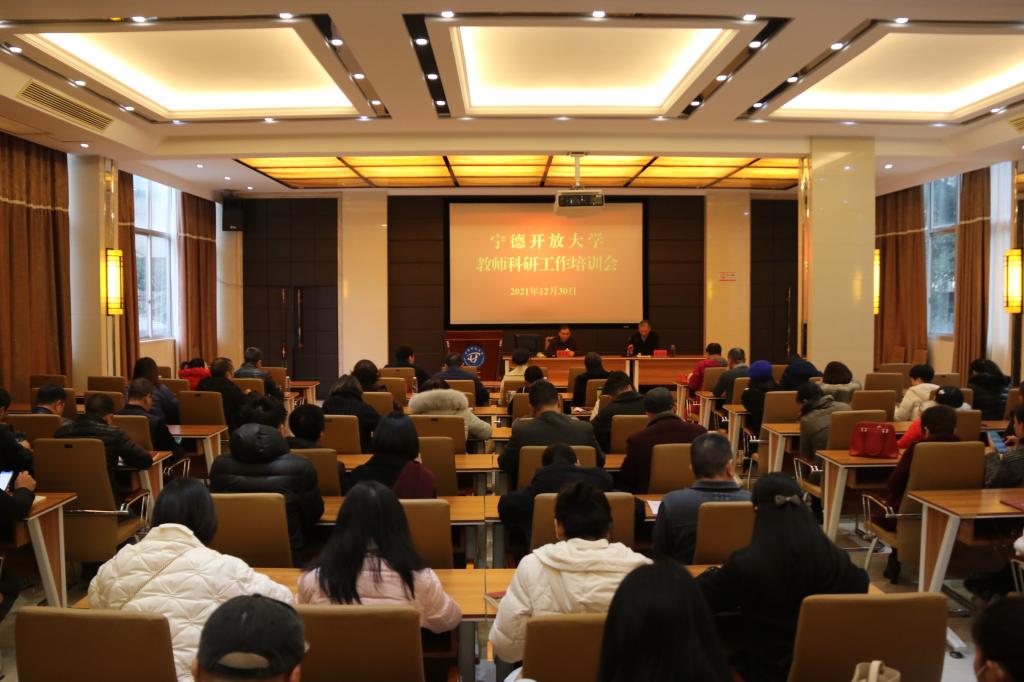 12月30日下午,宁德开放大学举办全市开放大学系统教师科研工作培训会议,邀请福建开放大学科研处副处长黄庆安教授作题为《开放大学的老师如何提升科研能力》的专题讲座。宁德开放大学全体教职工,各县级电大有关领导、负责人及部分教师参会,会议由宁德开放大学副校长林承毅主持。