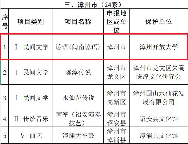 近日,福建省人民政府公布第七批省级非物质文化遗产代表性项目名录。漳州开放大学申报的非遗项目谚语(闽南谚语)入选。