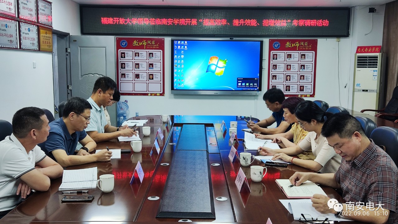 9月6日下午,为贯彻落实省委“提高效率、提升效能、提增效益”行动要求,了解基层办学需求,提升系统化办学服务能力,福建开放大学副校长李正光莅临南安学院开展考察调研活动,福建开放大学公共管理学院党总支书记、院长张海,泉州开放大学副校长林春成,南安市教育局副局长余雪娜等陪同调研。