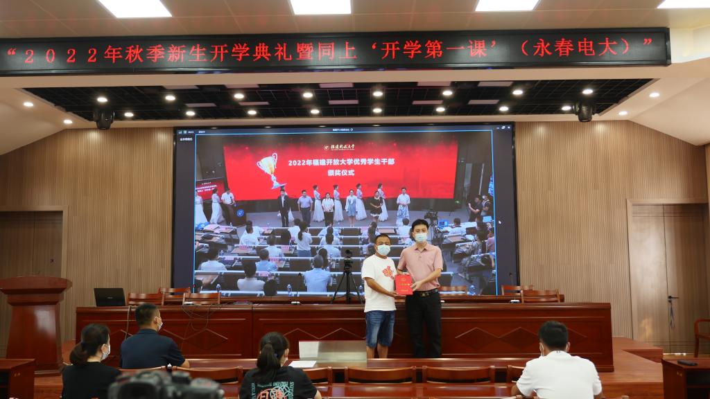 会上,陈志宏为2022年度优秀学生干部获得者许斌智颁发荣誉证书。