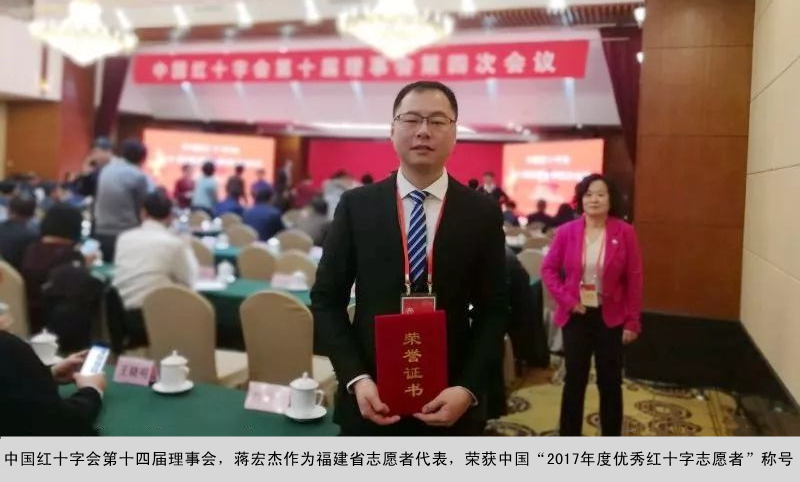 蒋宏杰曾是一名园林设计工程师、国家职业技能二级插花员技师,在一次爱心主题的花艺竞赛中,他偶然接触了解到志愿服务,被志愿者大公无私、仁爱助人的精神深深打动,从此蒋宏杰积极投身志愿服务,践行志愿精神,用自己的一腔热血,书写福州红十字志愿者的爱心之路。在践行志愿服务的历程中,蒋宏杰意识到学历和专业的重要性,毅然选择报读我校社会工作专业。