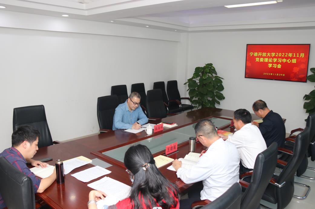 为学习宣传贯彻党的二十大精神和习近平新时代中国特色社会主义思想,11月29日下午,宁德开放大学党委召开理论学习中心组学习会。市委教育工委书记、市教育局党组书记、局长郭海鸣到会巡听旁听,宁德开放大学党委书记、校长叶祖庚,党委委员、副校长王晓飚,党委专职副书记李健平参加学习会。