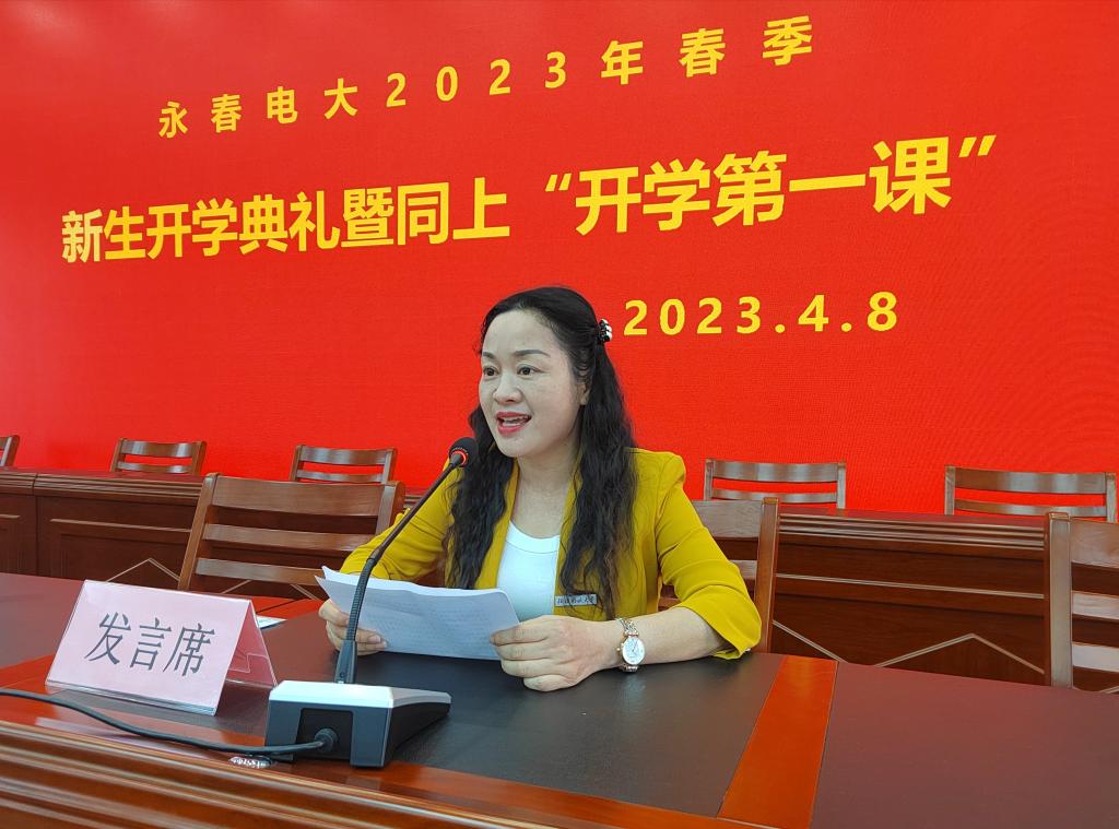 2023年春季专科班班长、泉州锦林环保高新材料有限公司采购总监王姬代表新生发言,她表示要严格遵守学校各项规章制度,认真做好学习规划、理顺工学矛盾,踔厉奋发、厚植家国情怀、涵养进取品格,不负时代不负华年、以奋斗姿态勇毅前行,在全面建设社会主义现代化生态永春实践中成就精彩人生。