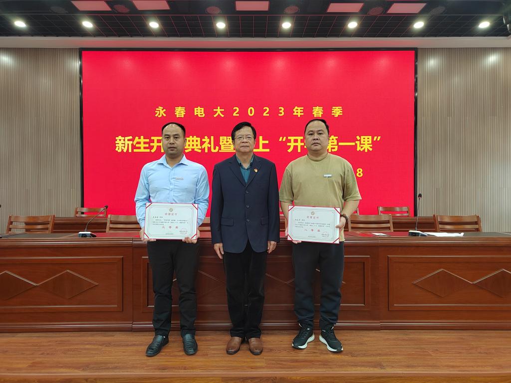 开学典礼上,李锦江为2021年度“国家开放大学优秀毕业生”获得者林志军,2021年度国家开放大学奖学金获得者刘伟政、王巧玲,2022年度福建开放大学“优秀毕业生”获得者吴应栋、郭素玉,2022年福建开放大学“喜迎二十大 强国由我”大学生网络文化作品二等奖获得者林志军、三等奖获得者吴应栋,2022年福建开放大学中华经典诵写讲大赛“笔墨中国”汉字书写比赛一等奖获得者黄更生、二等奖获得者康贵土颁发荣誉证书。