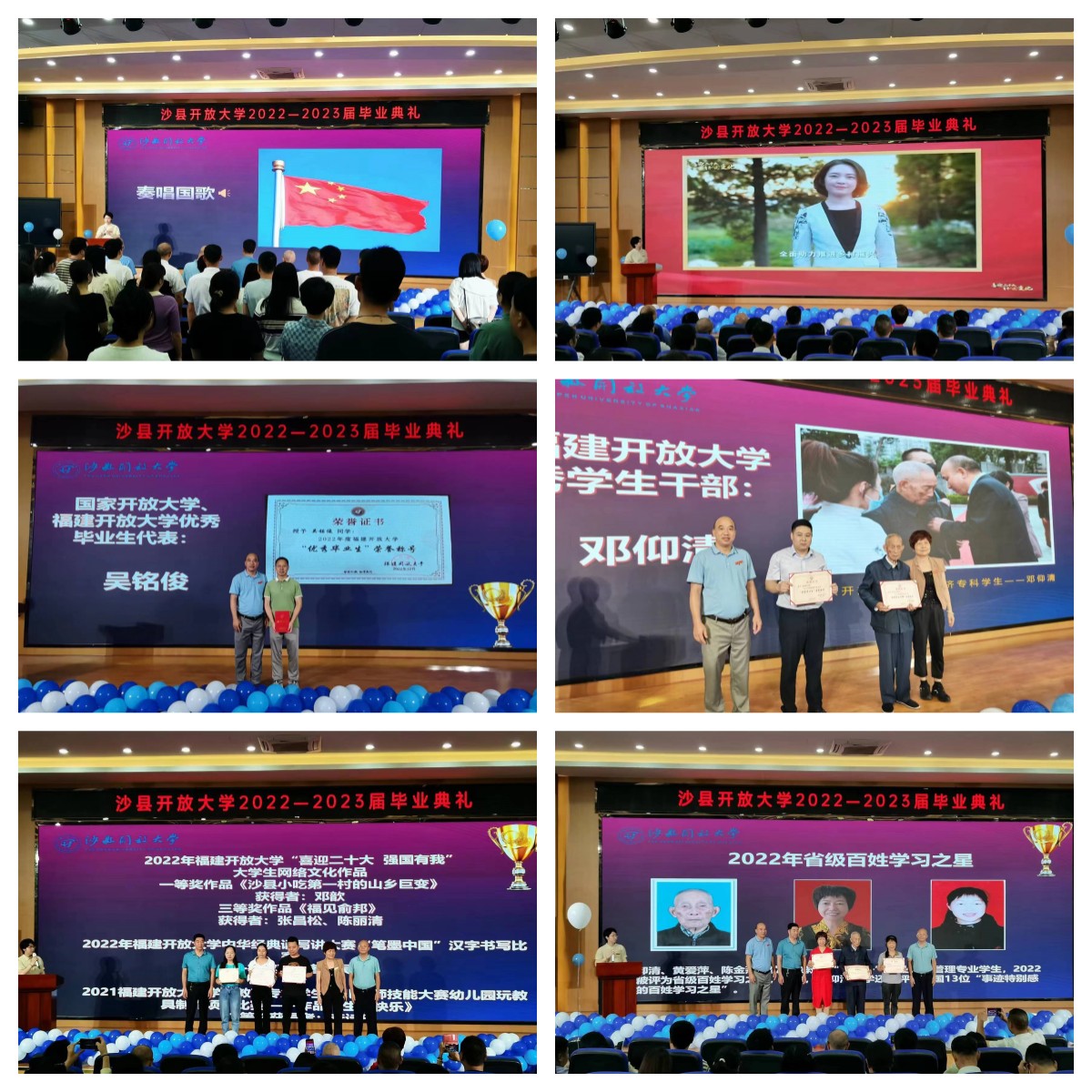 上午9点,毕业典礼正式开始,全体师生起立,奏唱国歌。随后,在场师生共同一起观看“喜迎二十大 青年说变化”福建青年演讲比赛一等奖获奖邓歆同学《沙县小吃第一村的山乡巨变》的作品展播。沙县开放大学支部书记、校长蔡志刚为福建开放大学优秀毕业生吴铭俊、优秀学生干部邓仰清颁奖。吴铭俊是学校2020年春季农业经济管理专科学生,三明生态新城农业科技投资开发有限公司总经理;邓仰清是2021年春季农业经济管理专科学生,已94岁高龄,展示了活到老学到老的精神,被评为全国13位“事迹特别感人的百姓学习之星”。典礼上还表彰了一批获奖的学生,他们是在“喜迎二十大 强国有我” 青年教师征文活动中一等奖获得者庄曾臻老师(作品《坚守教育阵地 做新时代开大人》),二等奖获得者张凯琳老师(作品《父亲的小店》);在2022年福建开放大学“喜迎二十大 强国有我”大学生网络文化作品一等奖作品《沙县小吃第一村的山乡巨变》获得者邓歆同学,三等奖作品《福见俞邦》获得者张昌松、陈丽清两位同学;2022年福建开放大学中华经典诵写讲大赛“笔墨中国”汉字书写比赛一等奖获得者吴茜同学;2021年福建开放大学学前教育专业学生幼儿教师技能大赛幼儿园玩教具制作项目比赛作品《生日快乐》荣获二等奖获得者李诗琪同学;2022年省级百姓学习之星邓仰清、黄爱萍、陈金燕等三位来自开放教育“一村一”农业经济管理专业的学生。