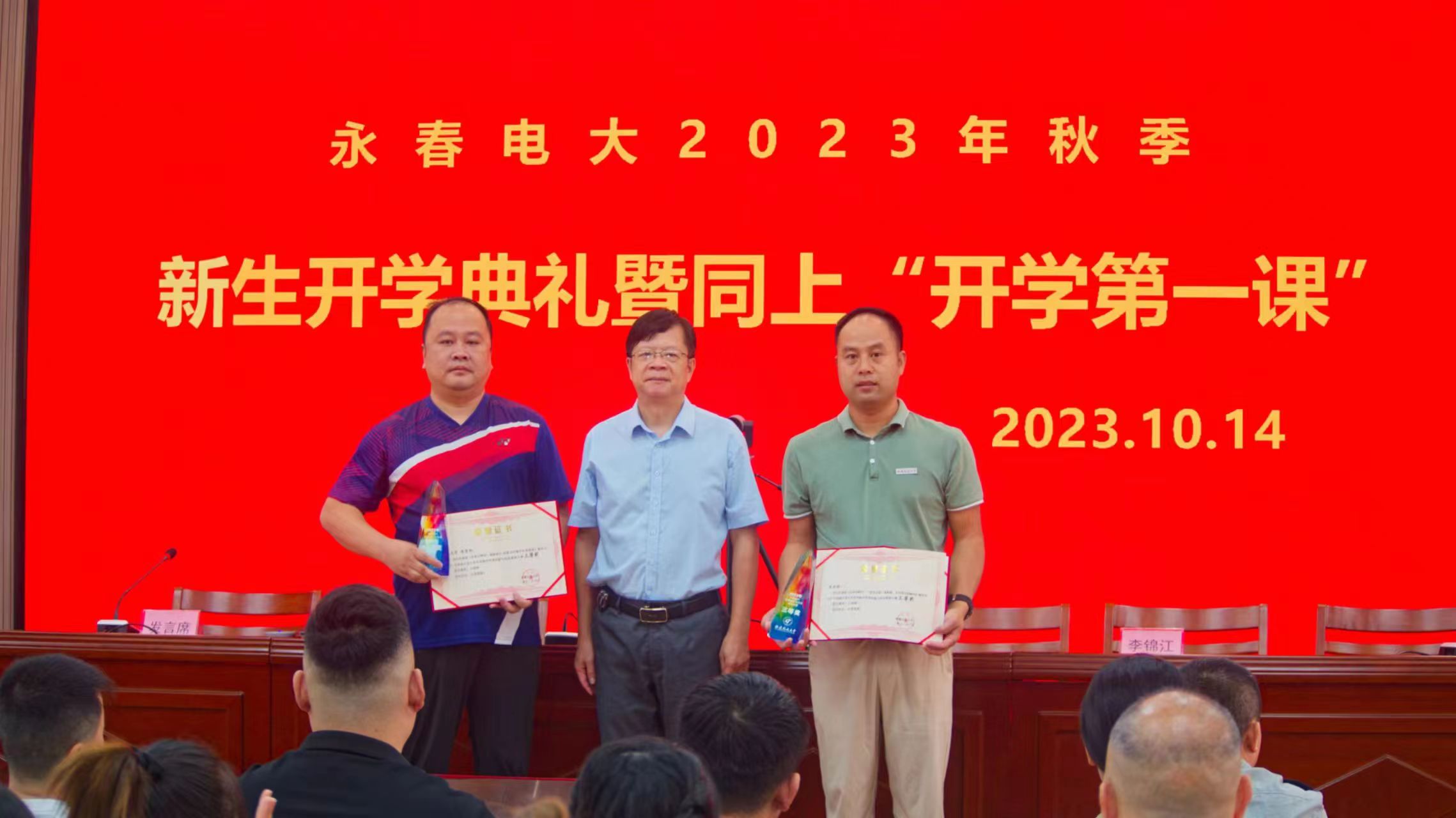 开学典礼上,李锦江分别为2021年福建开放大学学前教育专业学生幼儿教师技能大赛幼儿园玩教具制作项目一等奖获得者郑碧霞、2021年秋季福建开放大学开放教育“网上学习之星”获得者陈巧慧颁发荣誉证书,为2022年福建开放大学乡村振兴优秀创新与创业案例大赛三等奖获奖者吴应栋,林志军颁发荣誉证书和奖杯。