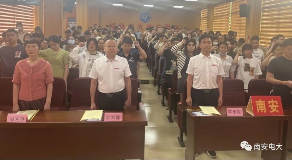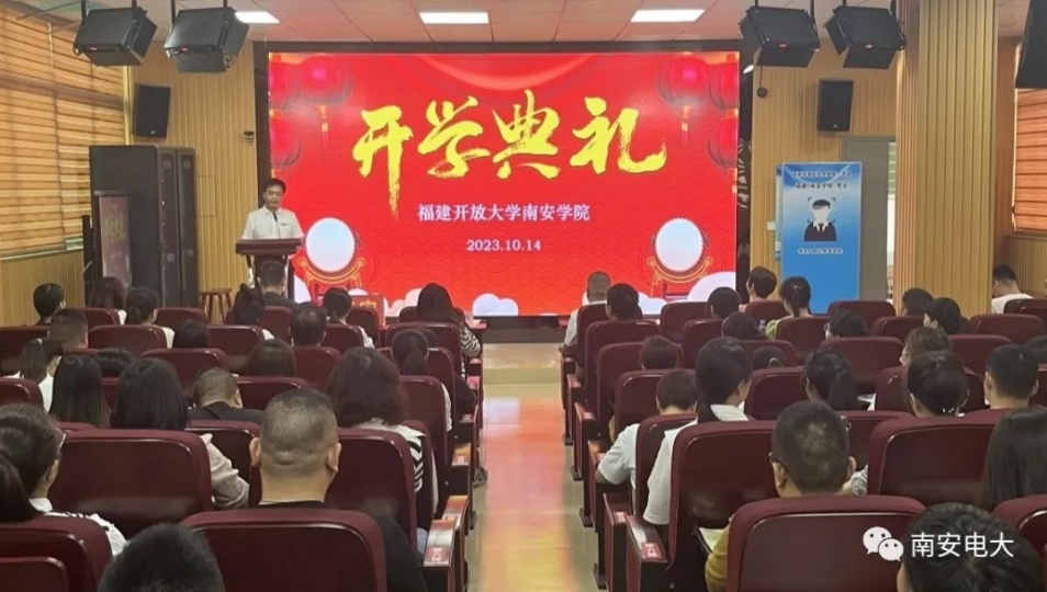 本次开学典礼活动,通过主会场与分会场互联互通的方式全省各地同步举行。10月14日上午,南安学院一楼智慧教室里,苏文德院长带领全体教职员工及2023年秋季399名新生分别通过现场和线上方式共同参与活动。南安学院分会场由专职副书记陈小教主持。