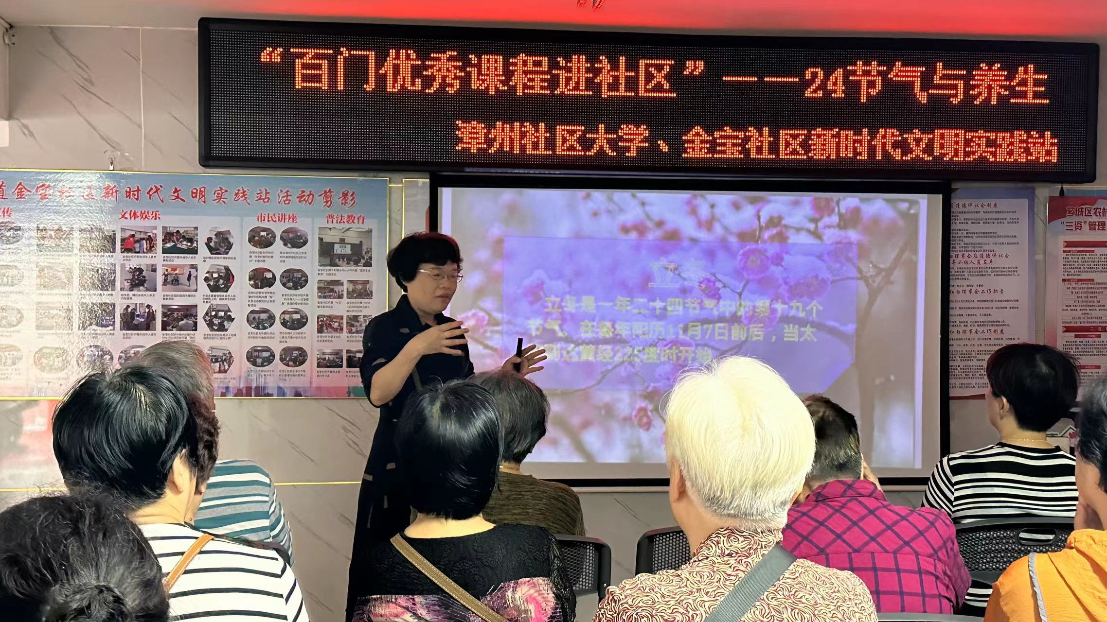 情暖重阳,爱在社区。在重阳节即将来临之际,为了大力弘扬中华民族尊老敬老的传统美德,进一步倡导敬老、爱老、助老的新风尚,10月19日上午,漳州开放大学“百门优秀课程进社区”来到金宝社区为老年居民们带来一堂精彩纷呈的公益讲座《二十四节气与养生》,主讲人漳州开放大学工会副主席林清清副教授。