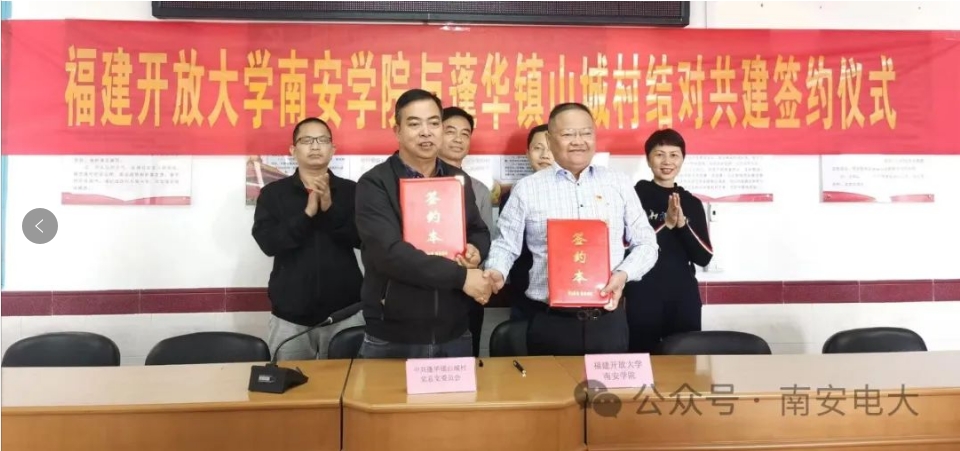 福建开放大学南安学院院长、书记苏文德,蓬华镇山城村负责人郭金海代表校村双方签署协议书。根据双方结对共建协议,双方将整合各类资源,打造文明实践结对共建项目和具有特色的文明实践活动场所,开展全方位、深层次、多样化的结对共建活动,推动结对共建工作落地见效。福建开放大学南安学院作为泉州市文明单位将认真履行社会责任,深度融入新时代文明实践体系,推动城乡精神文明建设融合发展,实现“阵地设施持续优化、项目活动常态开展、文化生活更加丰富、群众素质明显提升”的工作目标。