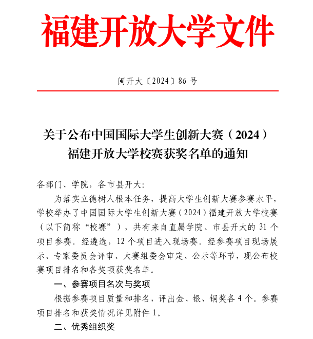 据悉,此次比赛共有来自福建开放大学直属学院、市县开大的31个项目参赛。经遴选,12个项目进入现场赛。经参赛项目现场展示、专家委员会评审、大赛组委会审定、公示等环节最终评出金、银、铜奖各4个,永春学院学生洪炜盛团队荣获中国国际大学生创新大赛(2024)福建开放大学校赛金奖。
