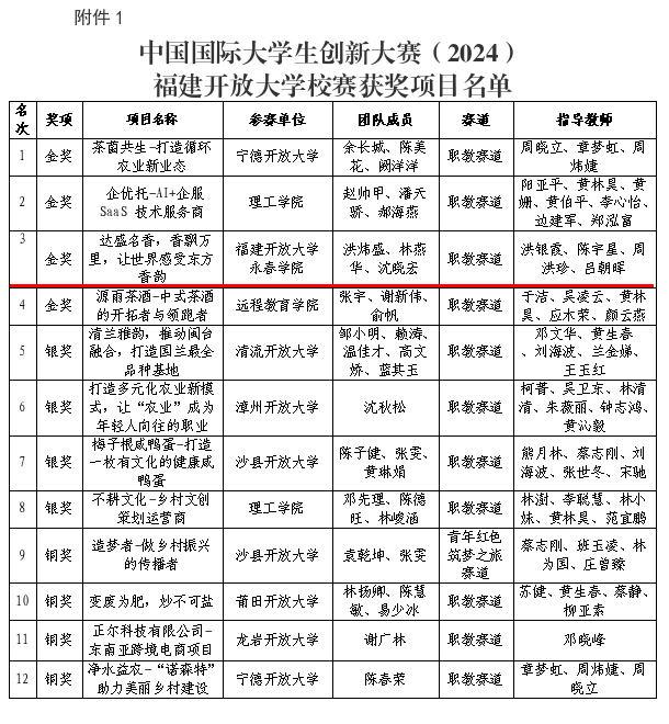 日前,中国国际大学生创新大赛(2024)福建开放大学校赛获奖名单揭晓,福建开放大学永春学院报送的《达盛名香,香飘万里,让世界感受东方香韵》项目荣获金奖,该项目3位参赛团队成员均来自泉州永春达盛香业股份有限公司,其中洪炜盛、沈晓宏为永春学院学生。