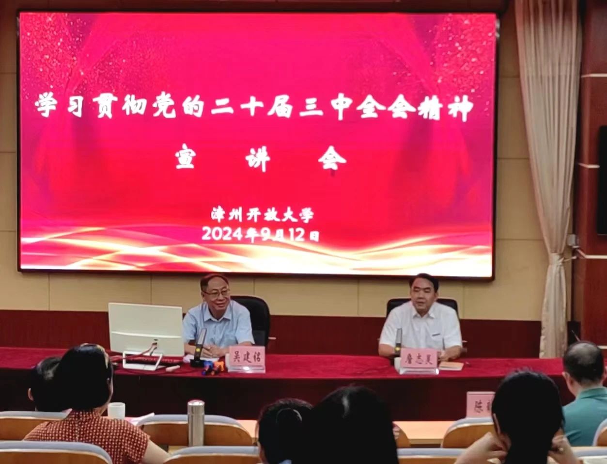 9月12日上午,福建开放大学党委委员、副校长吴建铭到漳州开放大学宣讲党的二十届三中全会精神,会议由漳州开放大学党委书记、校长詹志灵主持,学校班子成员及全体教职工参加。